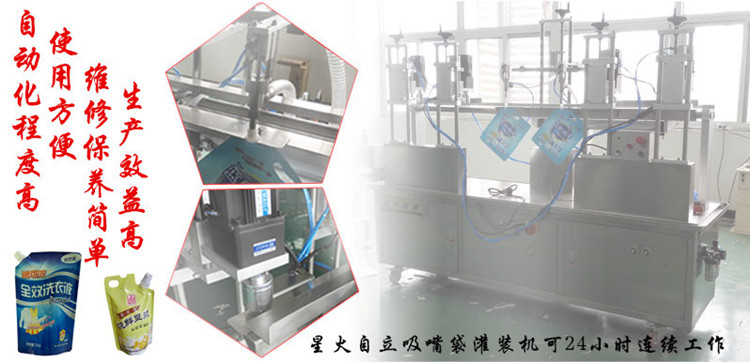 星火機(jī)械專業(yè)生產(chǎn)自立吸嘴袋灌裝機(jī),整機(jī)采用氣電相結(jié)合,只需人工上袋、上蓋,就能夠?qū)崿F(xiàn)自動(dòng)灌裝(兩次)、旋蓋、退袋等一系列工序,達(dá)到節(jié)能高效的目的;可根據(jù)客戶需求要增減部分功能;該機(jī)與物料接觸部分均采用304不銹鋼材料制作,產(chǎn)品衛(wèi)生,機(jī)器造型美觀,外觀光亮整潔;該機(jī)的自動(dòng)旋蓋裝置采用磁力+齒輪旋蓋、壓力可調(diào),袋蓋緊實(shí)不遺漏、具有自動(dòng)打滑功能使旋蓋松緊適當(dāng);該機(jī)帶有光電眼監(jiān)測(cè)袋蓋裝置,無(wú)袋不灌裝,無(wú)蓋可及時(shí)報(bào)警提醒操作人員檢查,及時(shí)調(diào)整,避免浪費(fèi)。